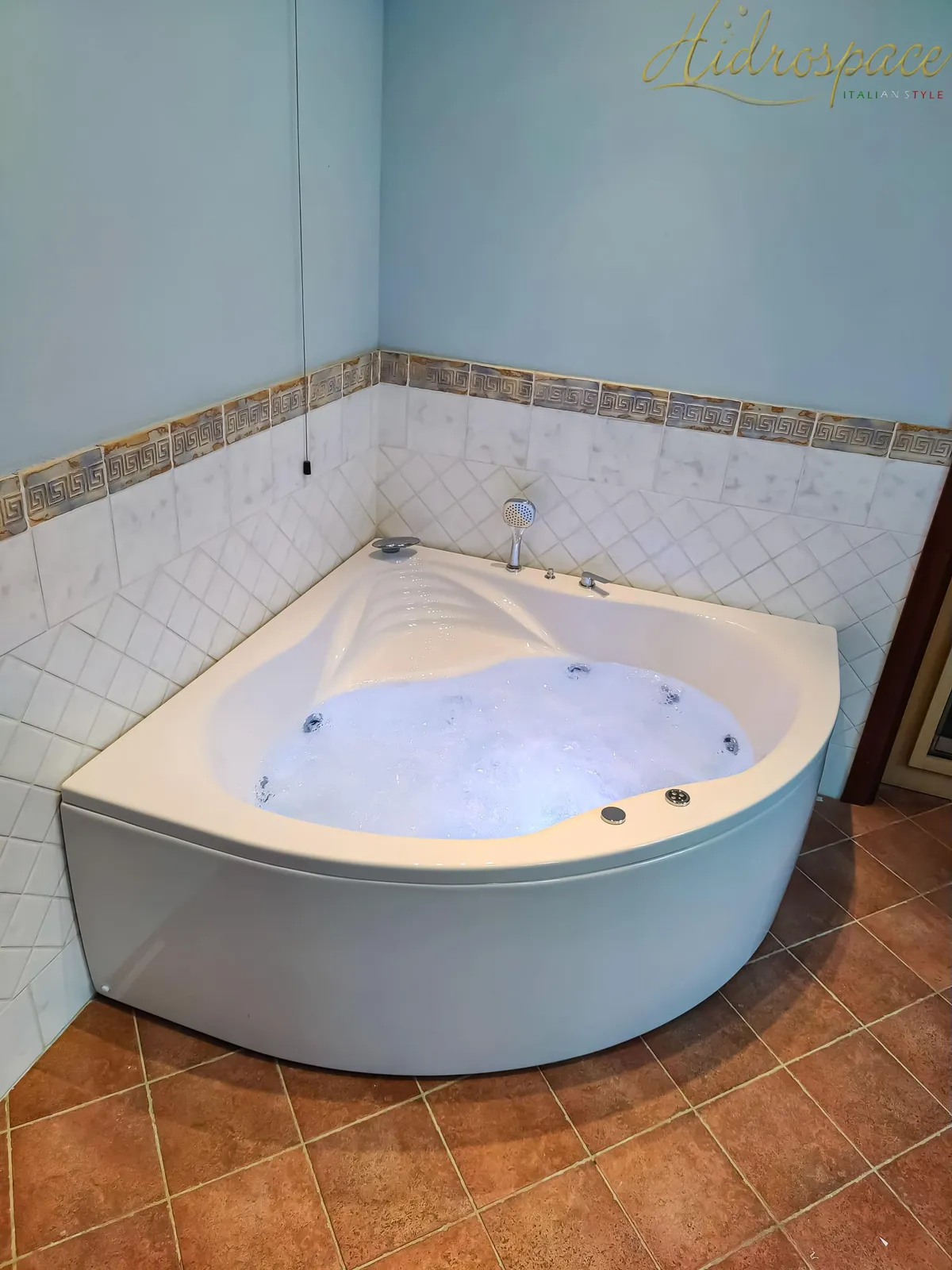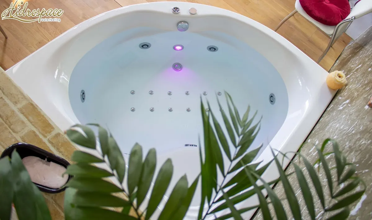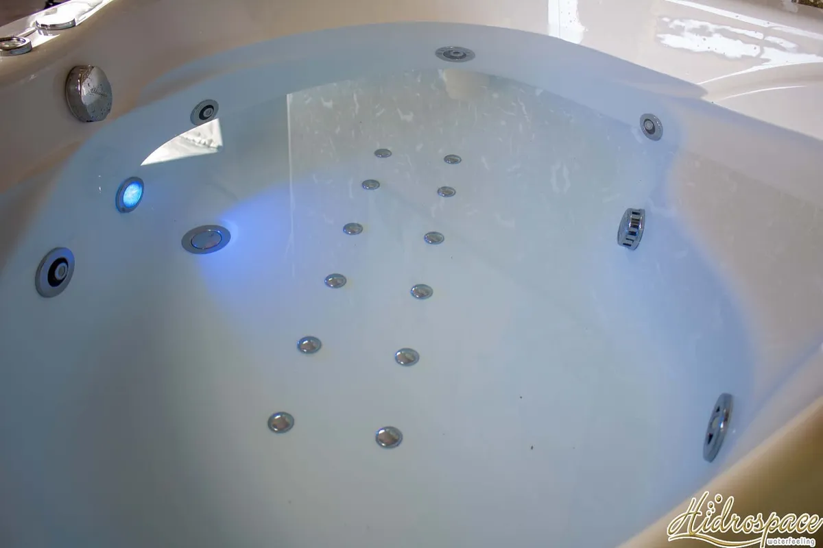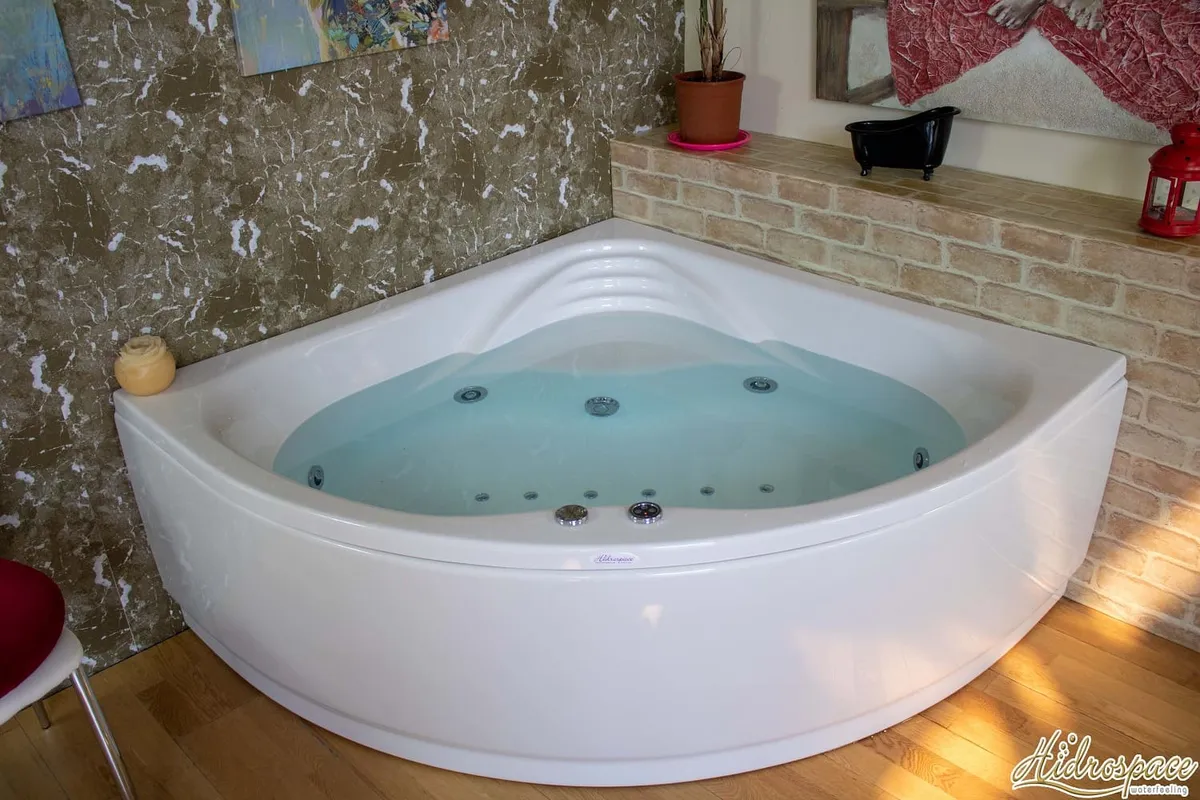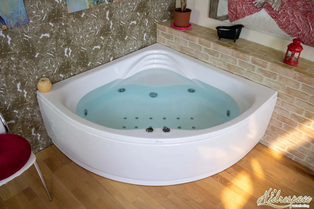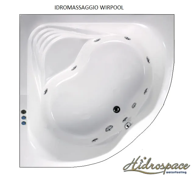 Victoria 140x140: bañera de hidromasaje angular con asiento, cascada, carcasa de acrílico reforzado, marco de acero galvanizado y tecnología Hidrosilent. Elegancia y confort.