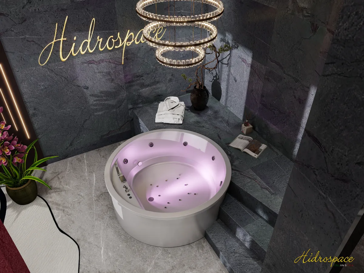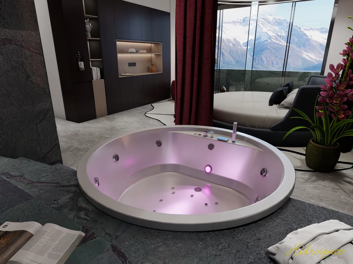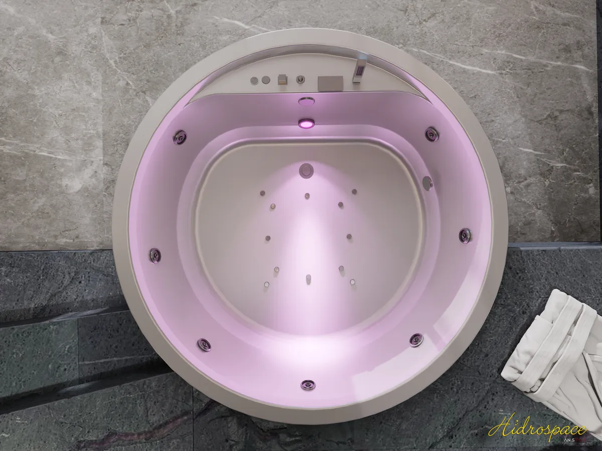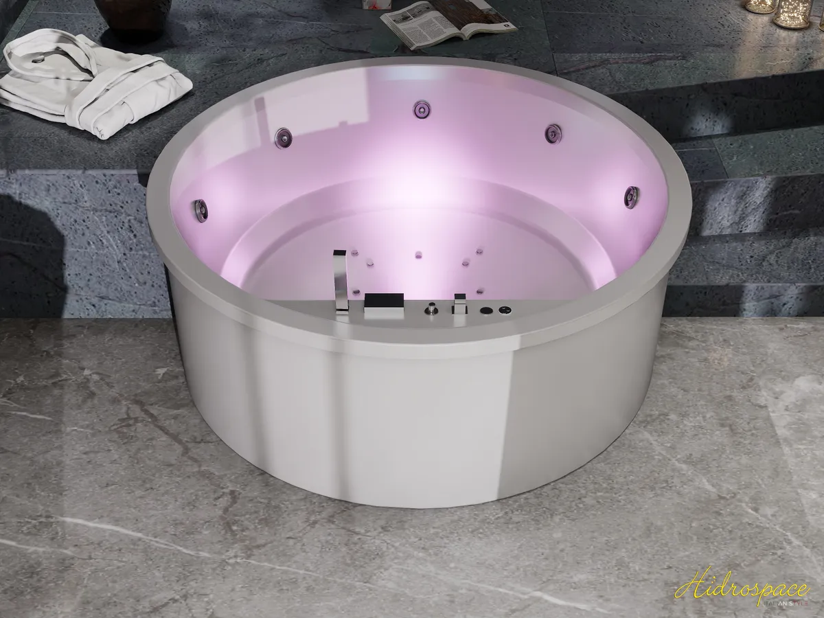 Baignoire ronde SUN 150 : balnéo de luxe diamètre 150 cm. Disponible en 3 configurations, fermetures en bois marin et accessoires exclusifs.