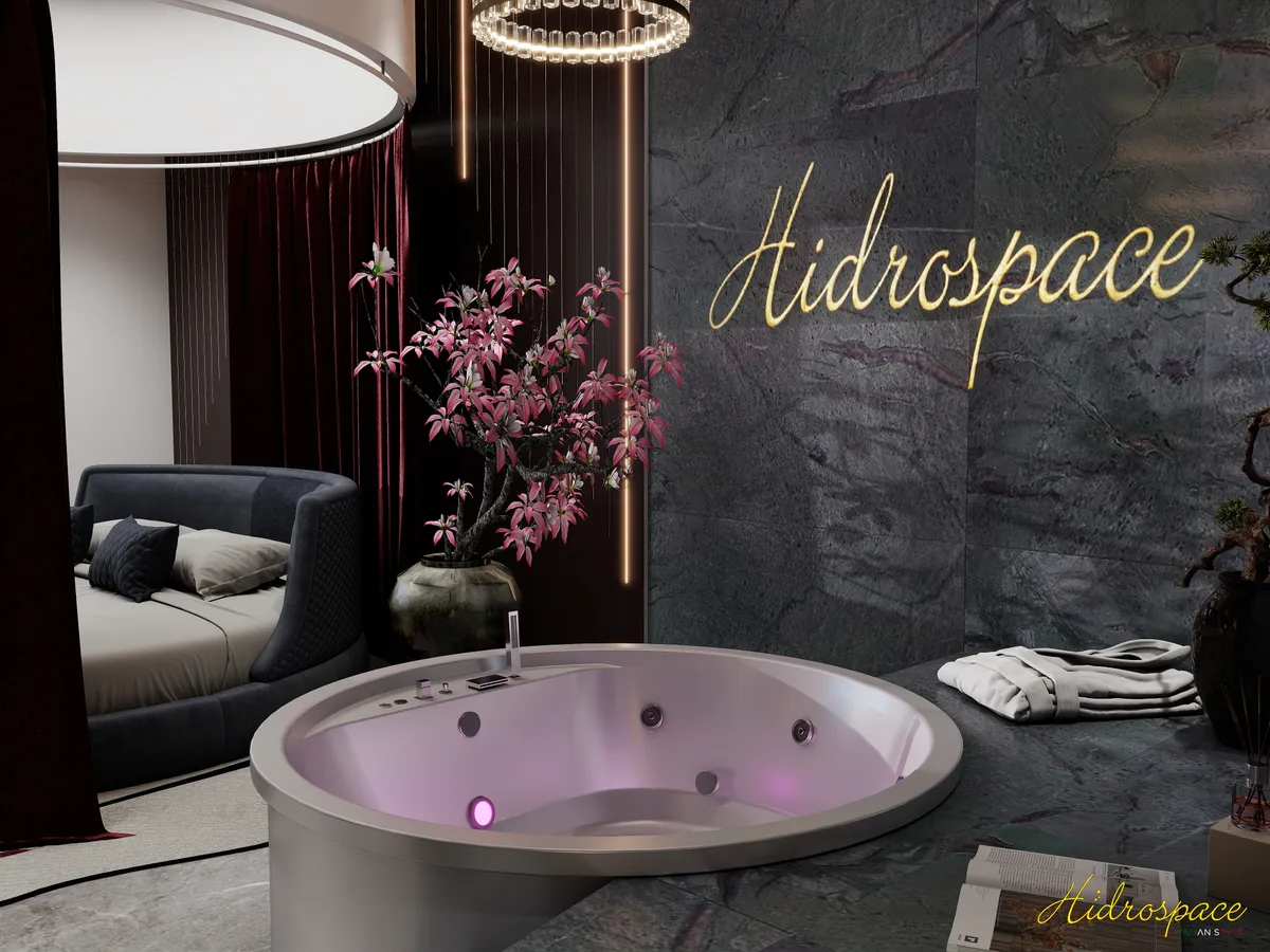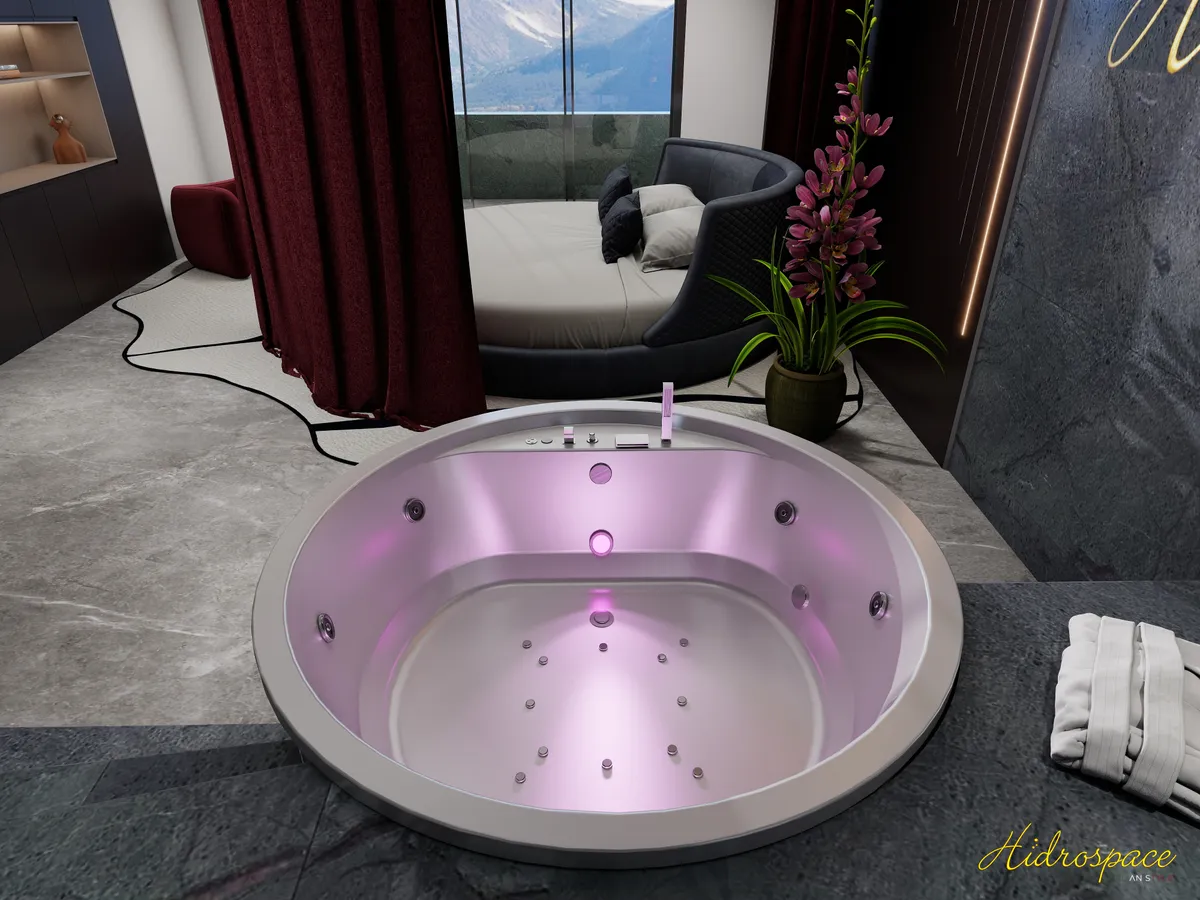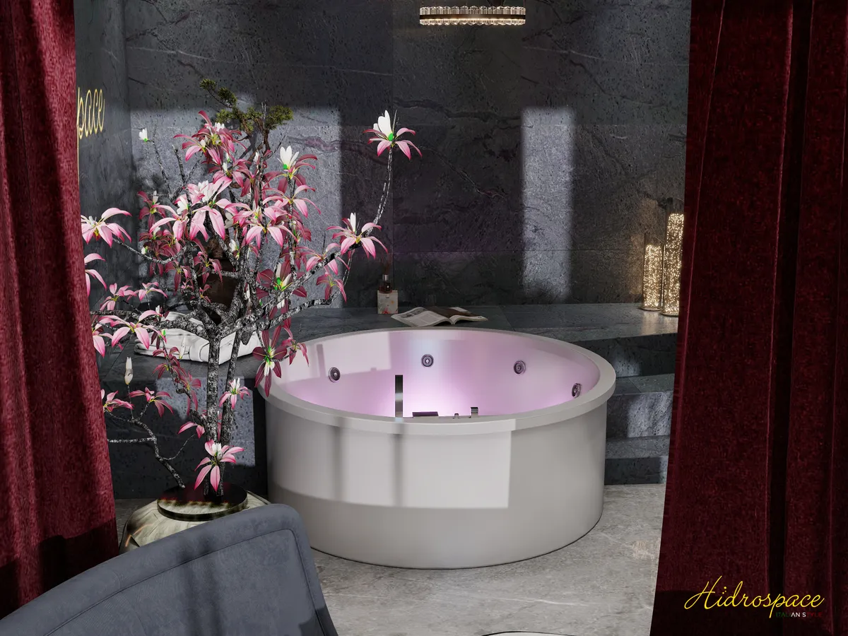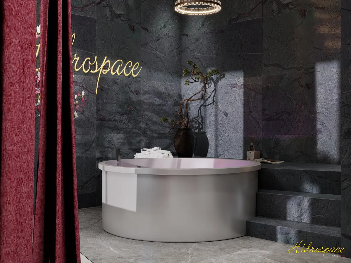 Baignoire ronde SUN 150 : balnéo de luxe diamètre 150 cm. Disponible en 3 configurations, fermetures en bois marin et accessoires exclusifs.