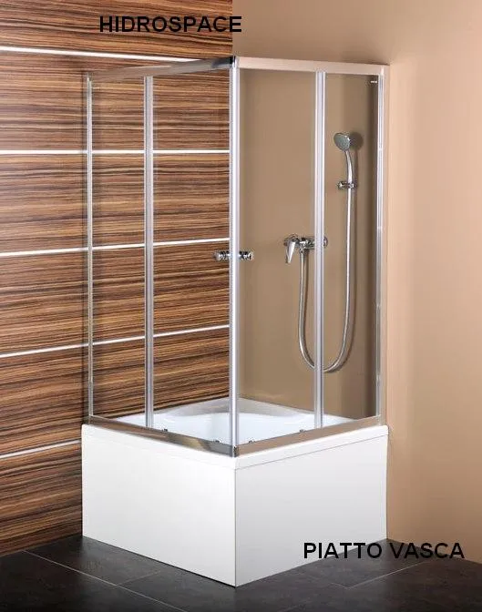 Olympia 90x90: Italiaanse luxe op maat. Lucite acryl bad-douche, stalen frame, compact ontwerp. Drie modulaire configuraties voor exclusief comfort.